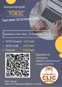 Announcement!!! for TOEIC Leave a Comment / By Oranuch Klammat / 2025-10-25 When October 25, 2025 8:00 am - 12:00 pm Add To Calendar Download ICS Google Calendar iCalendar Office 365 Outlook Live Event Type TOEIC test Test Date: 25 October 2025 – Register before 25 September 2025 Click https://forms.gle/iTte6q6JkJVekvue6 Test Venue: Nakhon Si Thammarat Rajabhat University (Nakhon Si Thammarat) จำนวนผู้เข้าชม: 9