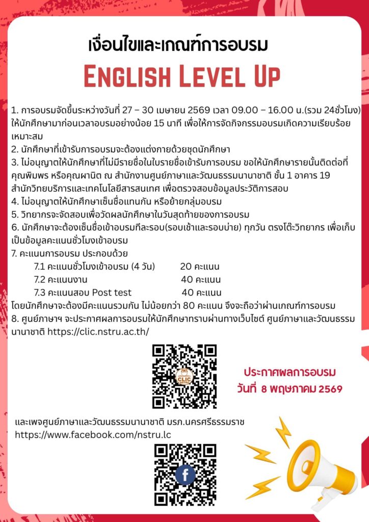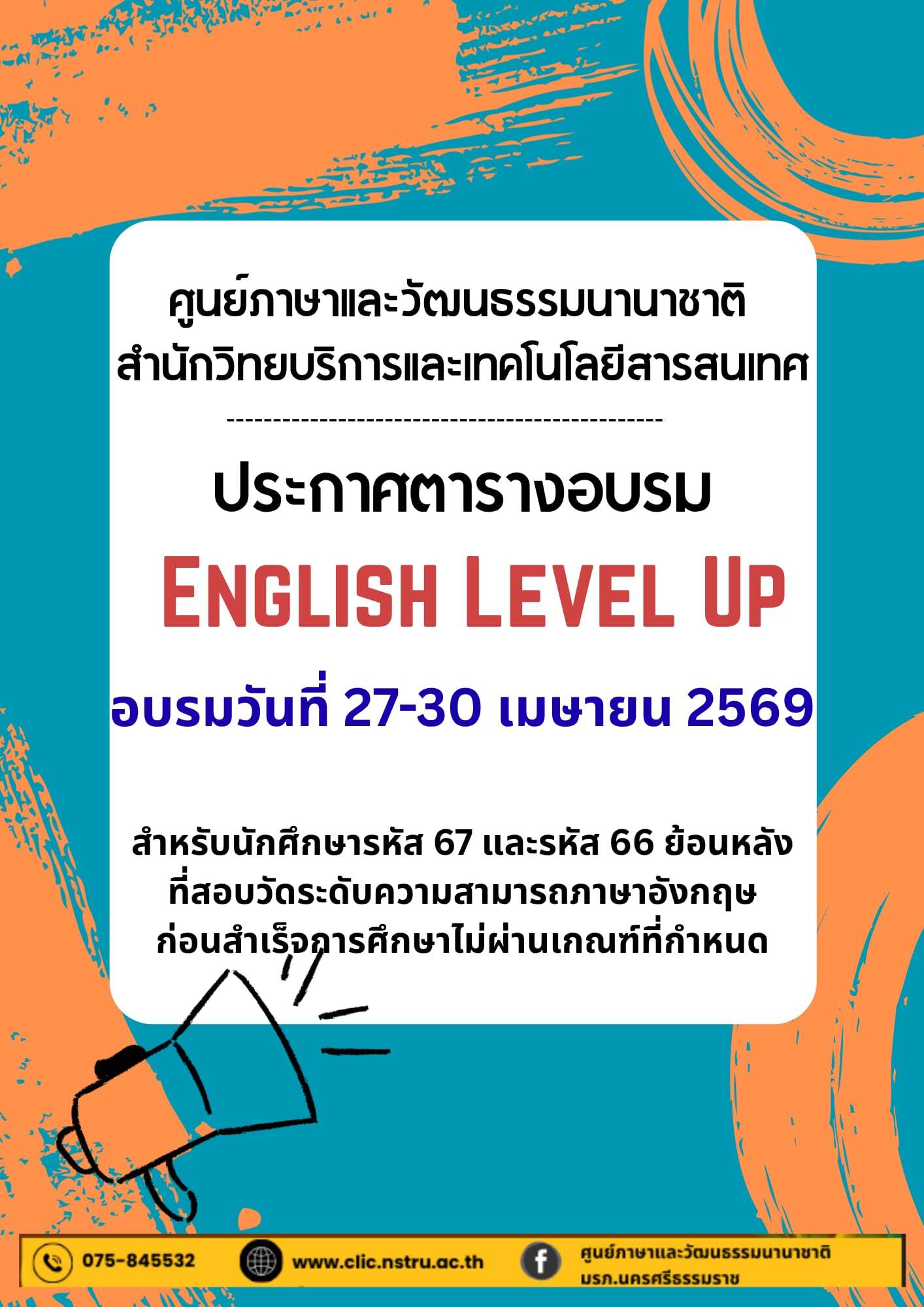 📢ศูนย์ภาษาและวัฒนธรรมนานาชาติ สำนักวิทยบริการและเทคโนโลยีสารสนเทศ มหาวิทยาลัยราชภัฏนครศรีธรรมราช ขอแจ้งให้นักศึกษารหัส 67 และรหัส 66 ย้อนหลัง ที่สอบวัดระดับความสามารถภาษาอังกฤษ English Exit Exam ตามกรอบมาตรฐาน CEFR ก่อนสำเร็จการศึกษาไม่ผ่านเกณฑ์ที่กำหนด ต้องเข้ารับการอบรม “English Level Up” โดยนักศึกษาสามารถตรวจสอบตารางการอบรมของวันที่ 27 – 30 เมษายน 2569 ได้แล้วที่ปุ่มข้างล่างนี้