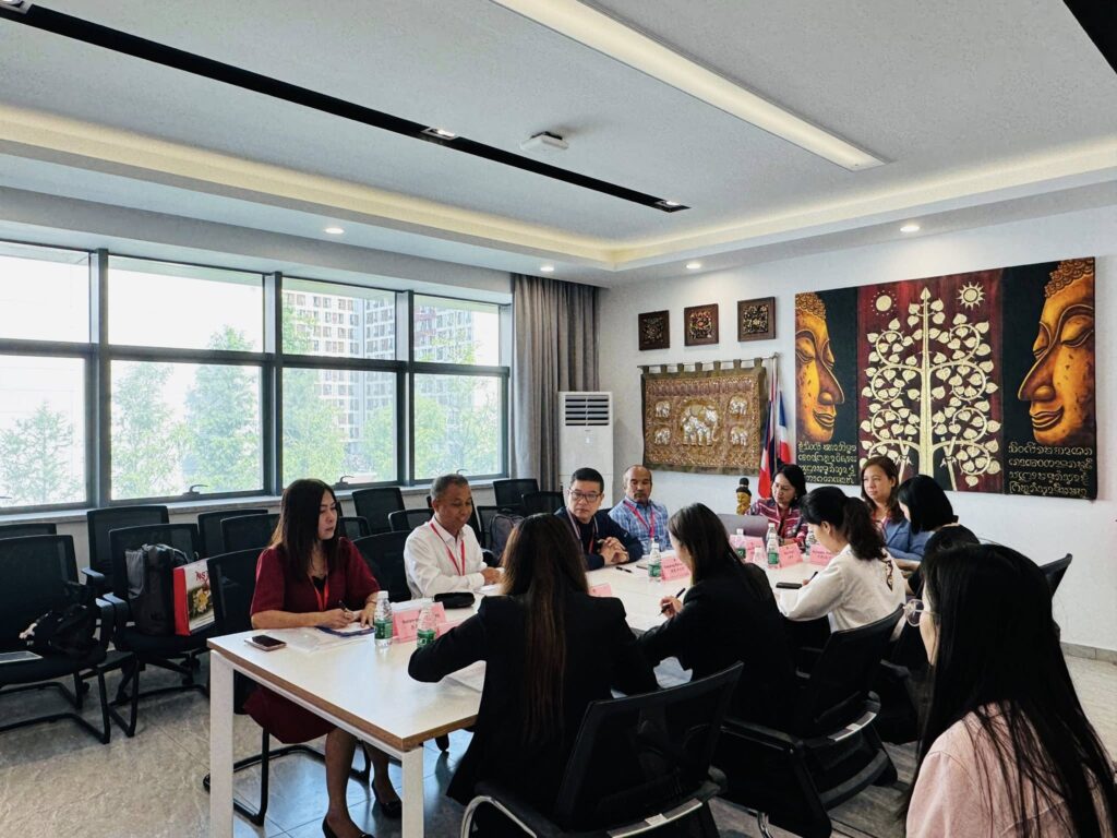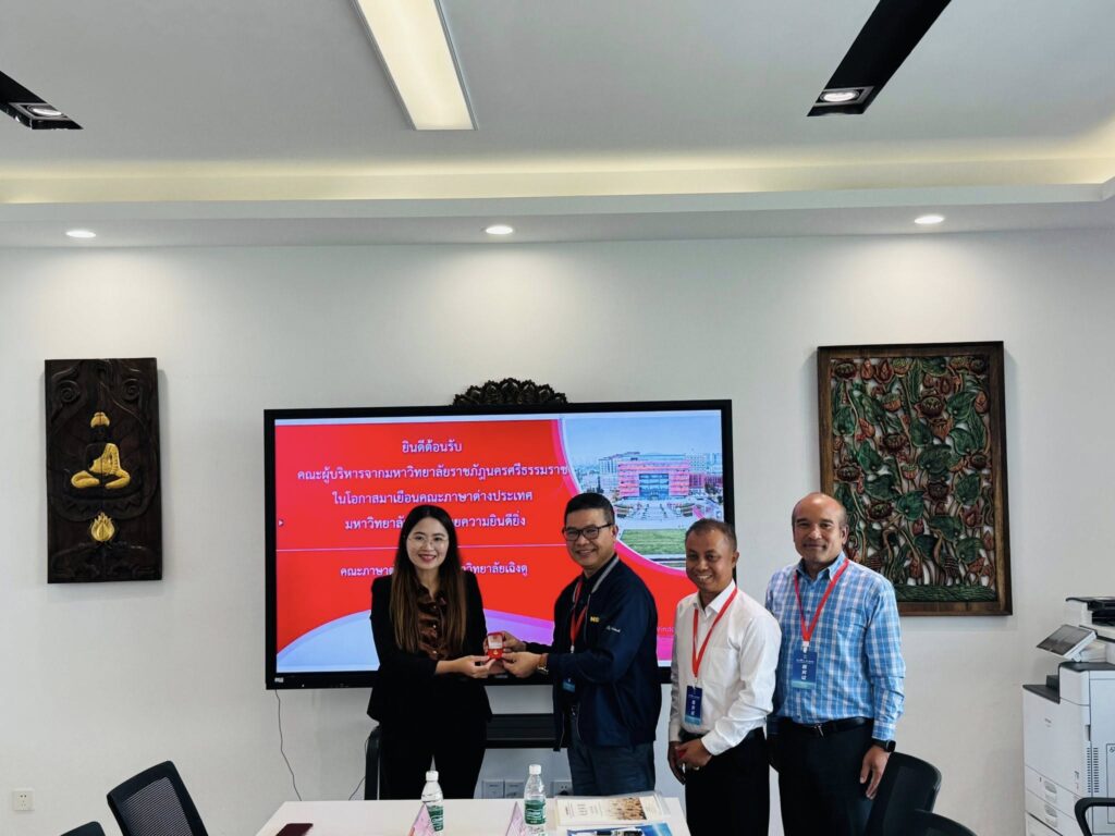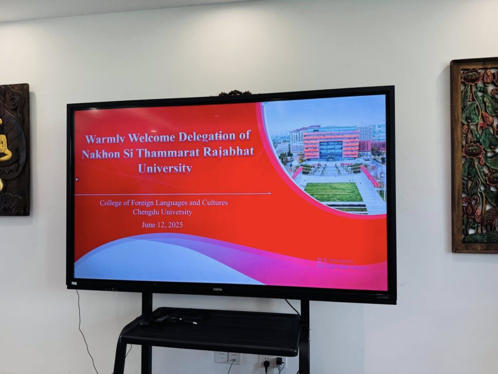 On June 12, 2025, Dr. Sompong Raksatham, Acting President of Nakhon Si Thammarat Rajabhat University (NSTRU), together with Asst. Prof. Dr. Somrak Rodcharoen, Vice President for Research and Information Technology, Asst. Prof. Dr. Surin Thongthot, Dean of the Faculty of Humanities and Social Sciences, deputy deans, representatives from the Office of Academic Resources and Information Technology, and staff from the Division of International Strategy and Relations, held a collaboration meeting with executives from Chengdu University, People’s Republic of China.