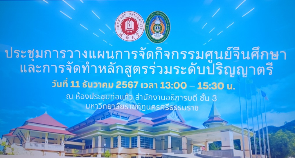 On December 11, 2024, at 13.00 hrs, the Division of International Strategy and Relations, Nakhon Si Thammarat Rajabhat University (NSTRU), organized a meeting on the planning of activities for the Chinese Studies Center and the development of a joint undergraduate program. The meeting, held at Korkaew Meeting Room, Office of the President, was chaired by Dr. Sompong Raksatham, Acting President of NSTRU.