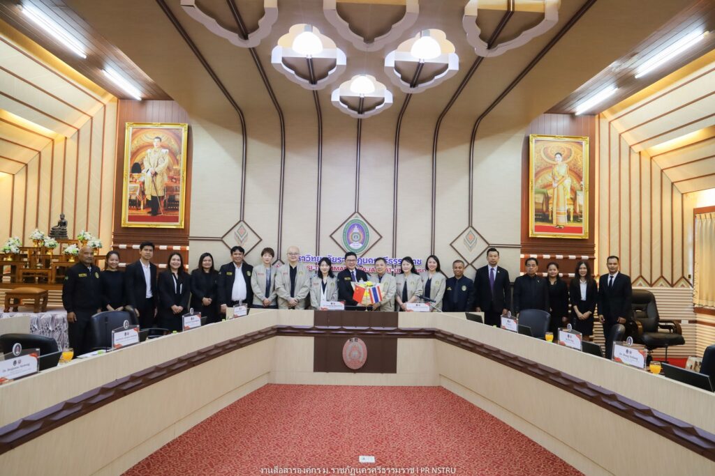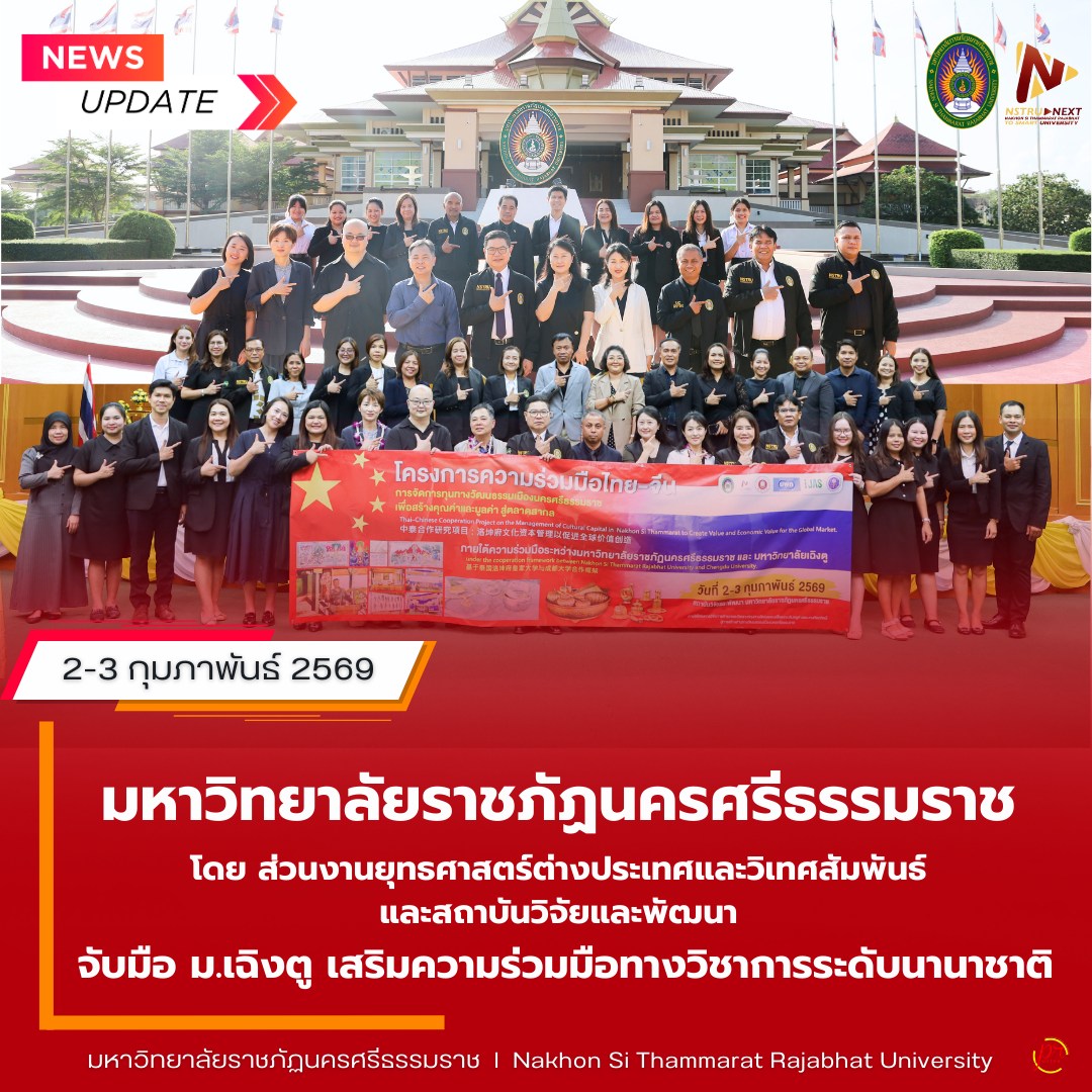 On 3 February 2026) at 8:30 a.m., Nakhon Si Thammarat Rajabhat University, through the Division of International Strategy and Relations and the Research and Development Institute, jointly organized an academic cooperation meeting with a delegation from Chengdu University, People’s Republic of China. The meeting was held at Tho Kaeo Meeting Room, Office of the President, Nakhon Si Thammarat Rajabhat University, and was chaired by Dr. Sompong Raksatham, Acting President.