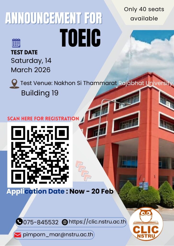 #CLIC NSTRU #ศูนย์ภาษาและวัฒนธรรมนานาชาติ มรภ.นครศรีธรรมราช #CU-TEP #TOEIC #TOEFL ITP # OOPT #ARITNSTRU